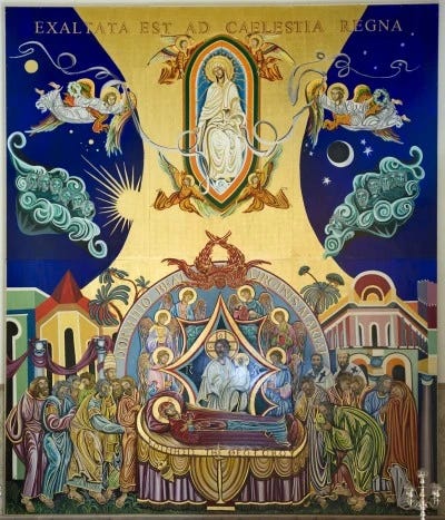 So, one last time: where is the Assumption of the Blessed Virgin Mary revealed to us? The answer to the question is that for those who see in the words and deeds of sacred scripture the pattern of our own redemption—that is, for those who think with the logic of God—the dogma of the Assumption of the Blessed Virgin Mary is there in plain sight. For those possessed of spiritual vision—for those who see the connections between the persons and events and testimony of scripture—the dogma of the Assumption of Mary is obvious. The reality of the Immaculate Conception; the mystery that the Christ-child is born from her flesh; the love that she bears for her son; the witness that she gives to the Apostles; the way in which she is presented as the new Eve through whom creation will be restored; there in plain sight within the words and deeds of scripture is the truth of the Assumption. The life of Mary is a life that would not know the corruption of the body. And those who think with the logic of God trust in the Assumption of the Blessed Virgin Mary; in her Assumption they place their faith.